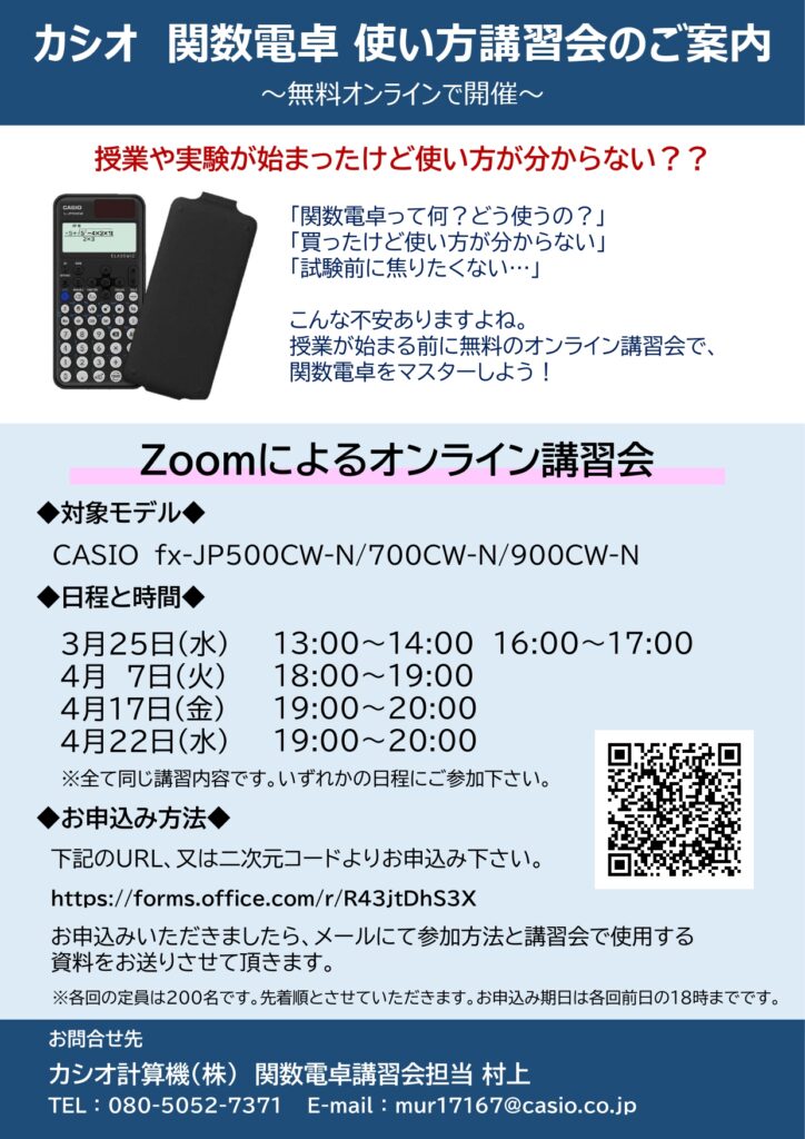 !!News!!関数電卓無料オンライン講習会のお知らせ!! 下記の日程で、関数電卓の無料オンライン講習会を開催いたします。お気軽にお申し込みください!! 3/25(水)4/7(火)4/17(金)4/22(水) お申込みURL https://forms.office.com/r/R43jtDhS3X